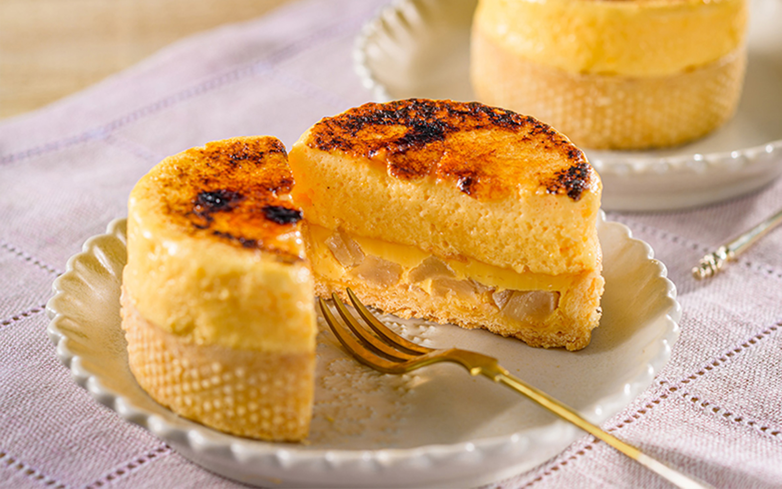 パイ生地に果物とクレームシブーストを重ね、表面をキャラメリゼしたフランスのお菓子。ふんわりとしたクリームと、ジューシーなりんご、キャラメリゼの香ばしい風味が口の中いっぱいに広がる、贅沢なスイーツです。