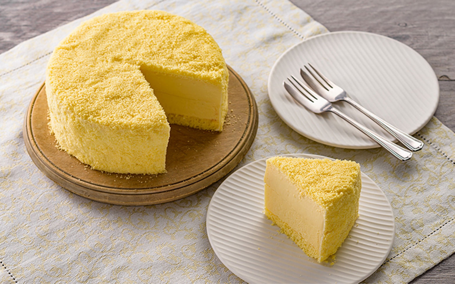 ベイクドチーズとレアチーズの2層のチーズケーキに、スポンジケーキのクラムをたっぷりとまぶしたドゥーブルフロマージュ。豆乳に加え、豆乳グルト(豆乳でつくったヨーグルト)を使用しています。