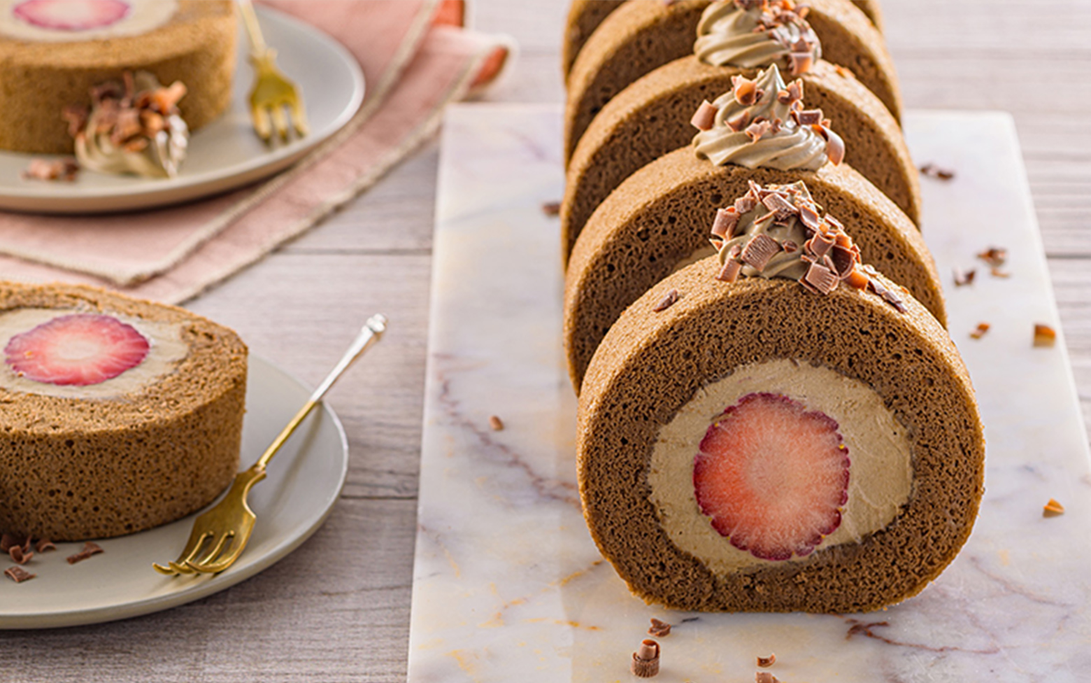 和スイーツ好きさんにおすすめしたい、ほうじ茶スポンジでほうじ茶クリームを巻いた、ほうじ茶尽くしのロールケーキ。ほうじ茶の香ばしさと豆乳のまろやかな味わいが相性抜群、甘酸っぱい苺がアクセントになっています。