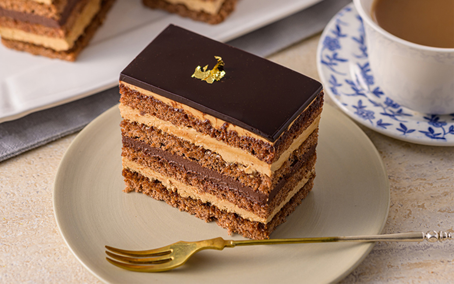 パリのオペラ座を模したオペラは、チョコレートとコーヒーの香り高い風味がマッチした、とてもリッチな味わいのチョコレートケーキ。アーモンドミルクを使用することで、さらに奥深い味わいになっています。