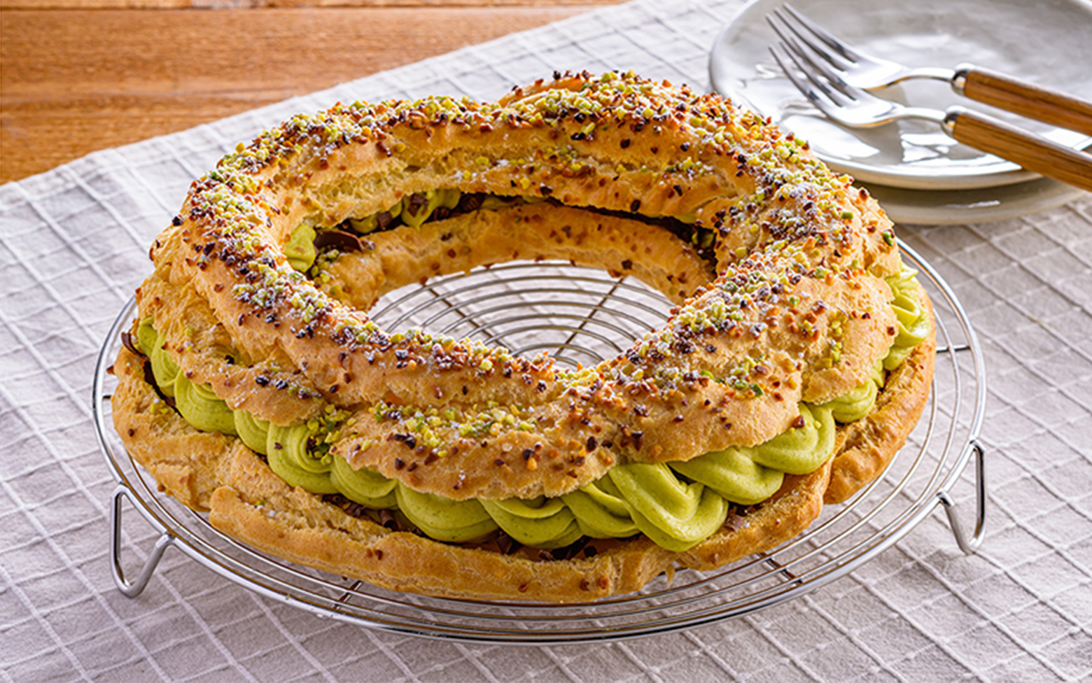 1891年、フランスの「パリ」と「ブレスト」を結ぶ、自転車ロードレースを記念して作られたお菓子。アーモンドのシュー生地に、アーモンドミルクのピスタチオクレームムースリーヌを挟み、華やかなパリブレストに仕上げました。
