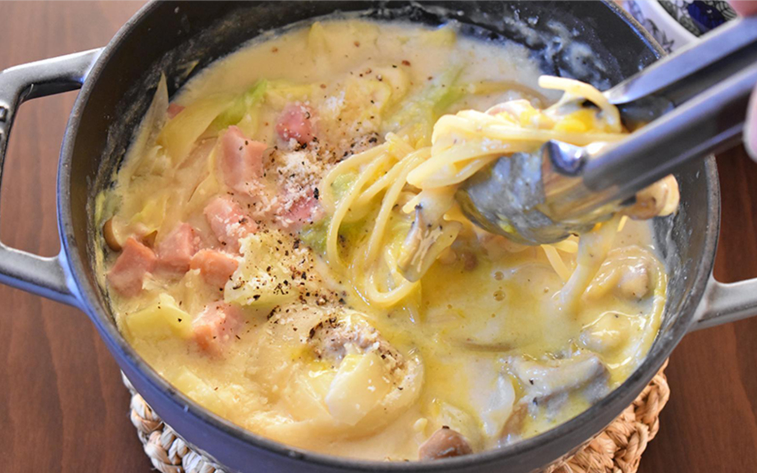 クリーミーな味わいで人気のカルボナーラを、鍋仕立てにして楽しんでみませんか?使用するのは、マルサンアイの「無調整豆乳」。牛乳や生クリームを使うよりもヘルシーでありながら、とても濃厚でコク深い味わいに仕上がります。