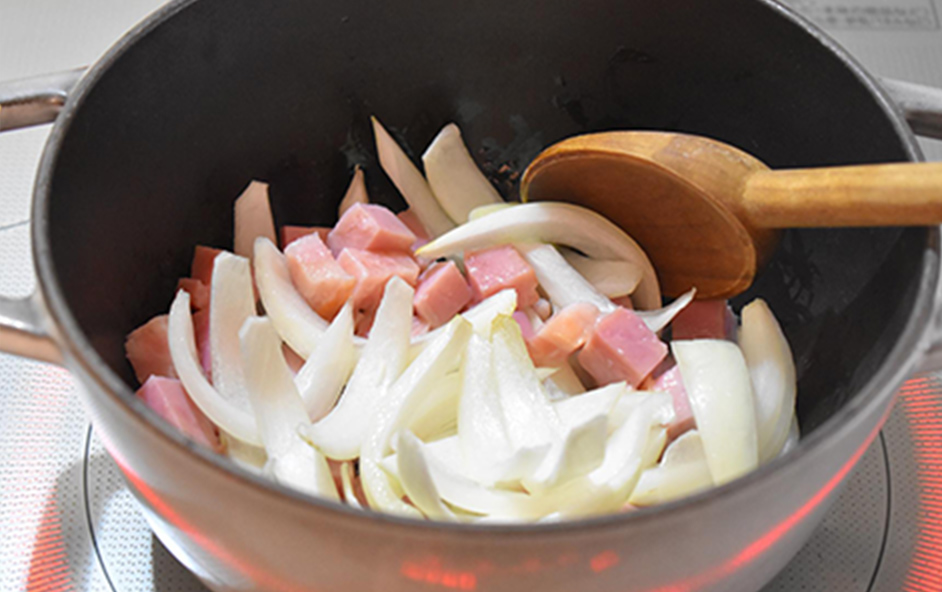 厚手の鍋に油(分量外)をひき、にんにくと玉ねぎ、ベーコンを炒めます。
