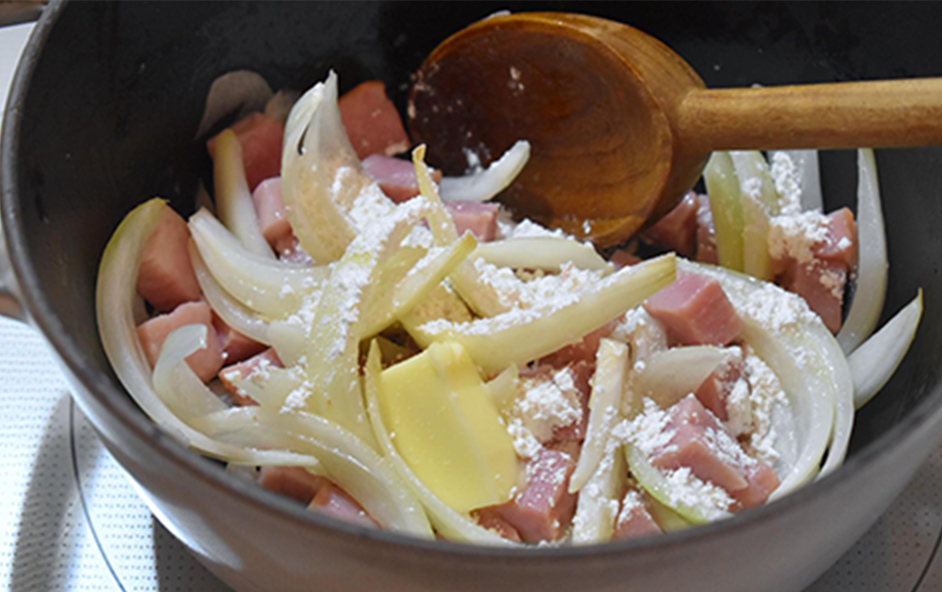 玉ねぎが少し透き通ってきたら、バターと小麦粉を加えます。