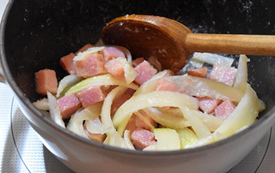 鍋でにんにく、玉ねぎ、ベーコンを炒める