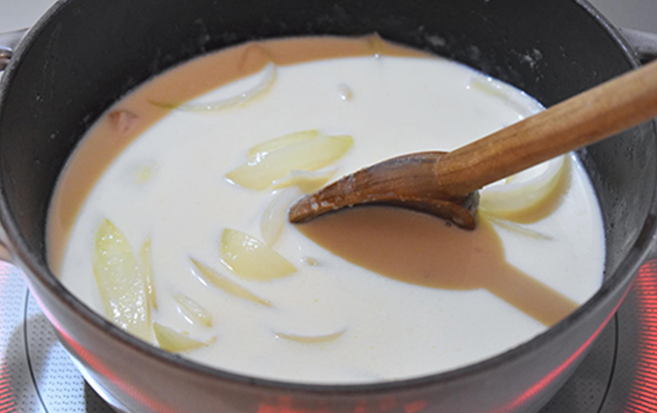 豆乳を加え、鍋底についた小麦粉などをヘラでこそげ取りながら、軽く煮立てます。