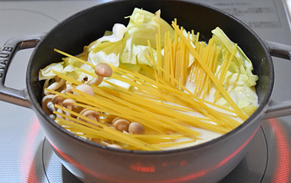 煮込み時間は、加えたパスタのゆで時間と同じくらい。パスタがくっつきやすいので、菜箸などでほぐしながら煮込みましょう。