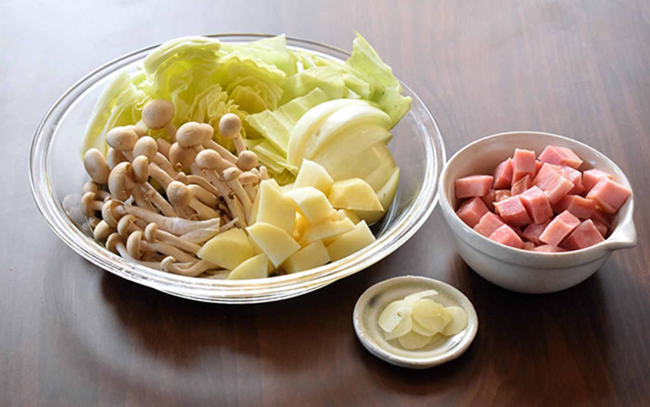 にんにくはスライスし、ベーコン、玉ねぎ、キャベツ、じゃがいもは食べやすい大きさにカットします。しめじは、ほぐしておきます。