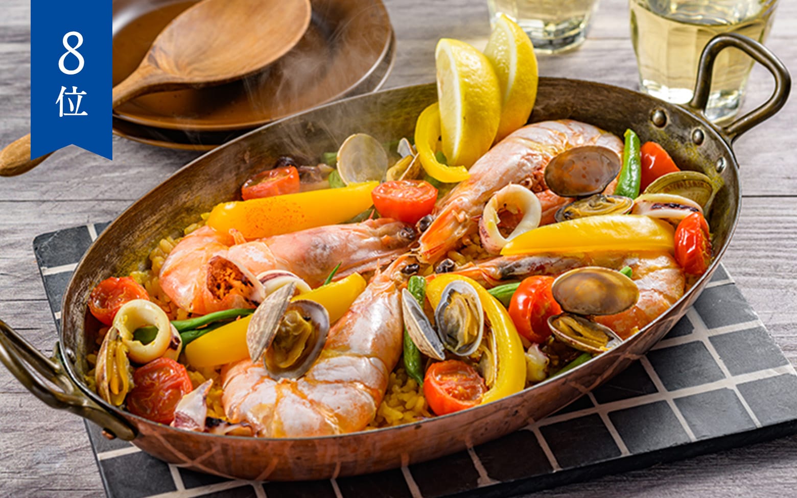 専用の浅い鍋「パエジェーラ」を使って調理される、サフランの黄金色が美しい米料理。完成したパエリアの底には「ソカラ」と呼ばれるお焦げができ、香ばしさと食感のアクセントになります。