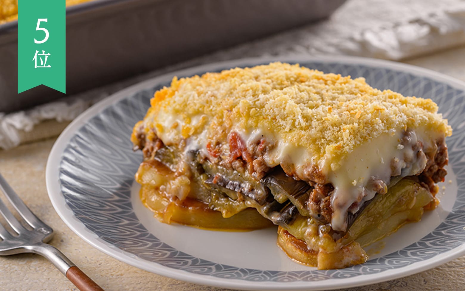 なすやじゃがいも、ひき肉などの具材を重ねてオーブンで焼いた、東地中海沿岸の国々で食べられている料理。その名は、アラビア語の「冷めても美味しい」という言葉に由来します。