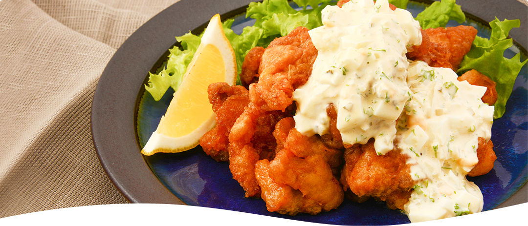 卵と薄力粉で作った衣に鶏もも肉をくぐらせ、170℃に温めた油で約3分揚げる。