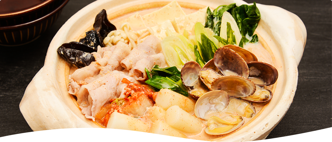 豚肉、春雨、きくらげ、トッポギ、ホウレンソウなど、韓国テイストに仕上げます。