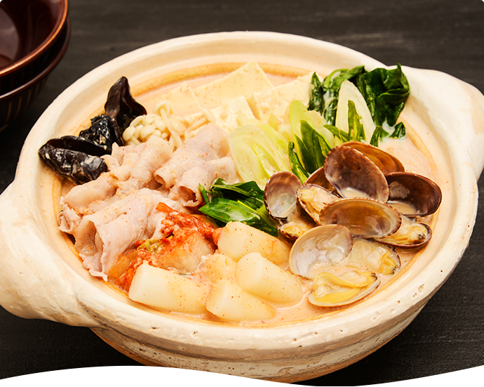 土鍋(もしくは鍋)に豚バラ肉、キクラゲ、トッポギ、キムチ、春雨、殻付きあさり、えのき、青とうがらし、長ネギ、ニラ、ほうれん草をバランス良く盛る。