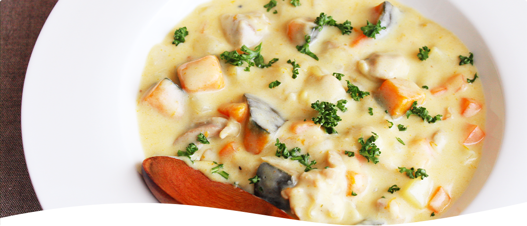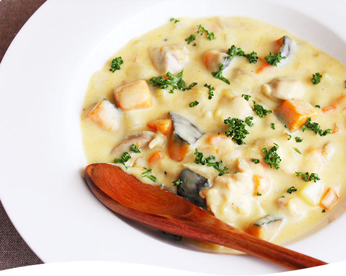 ④に豆乳を入れ全体を混ぜ、弱火で5分ほど加熱して完成。