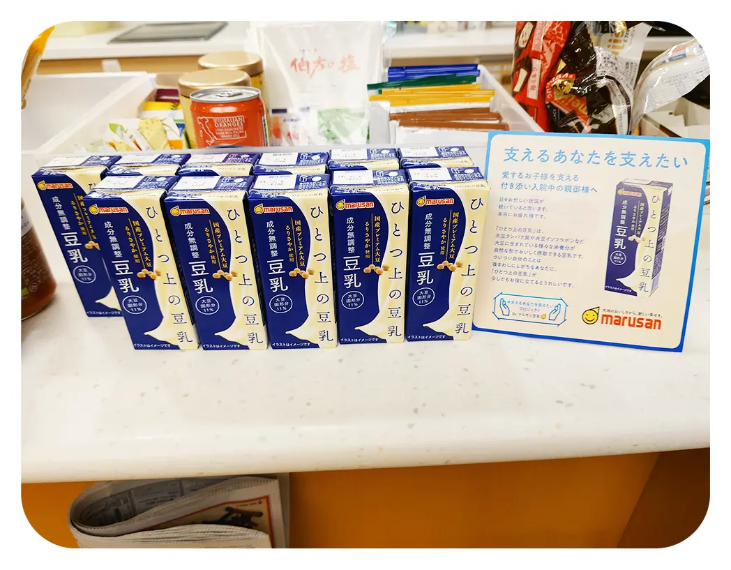 - 付き添い入院中の食生活はとても厳しく、栄養バランスを欠いてしまうので、常温保存可能でコンパクトな手軽に飲める豆乳は、多くの喜びの声が寄せられています。