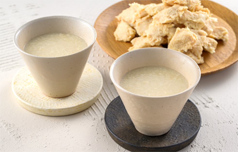 日本酒を作る際に発生する搾りかすの酒粕を水に溶かし、砂糖を加えて甘さを調整したもので、食物繊維を多く含みます。酒粕タイプの甘酒には微量のアルコールが含まれることがあるため、車を運転する際やアルコールに弱い方、20歳未満の方、妊娠中の方などは気を付けましょう。