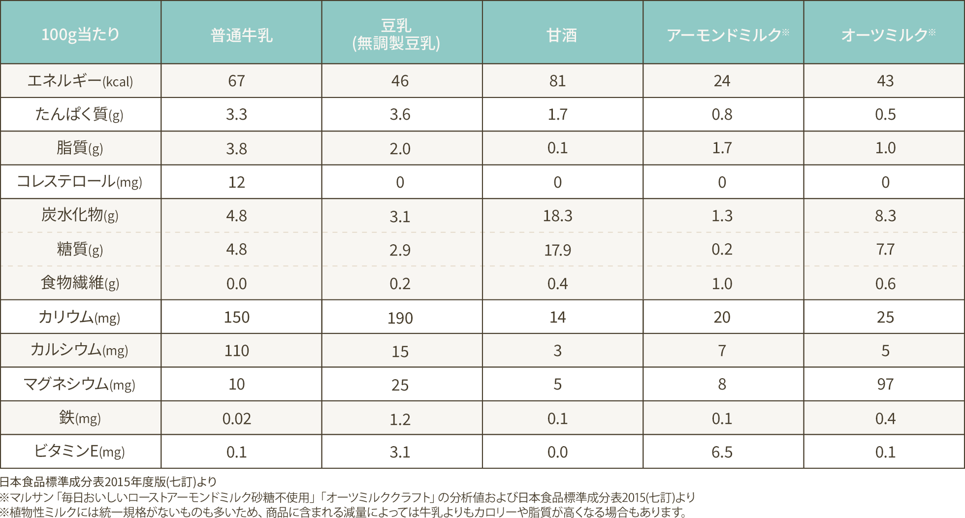 味わいもさまざまなのでその日の気分や、“大豆イソフラボンを摂りたい時は豆乳”、“ビタミンEを摂りたい時にはアーモンドミルク”など、目的に応じて選ぶのもよいでしょう。